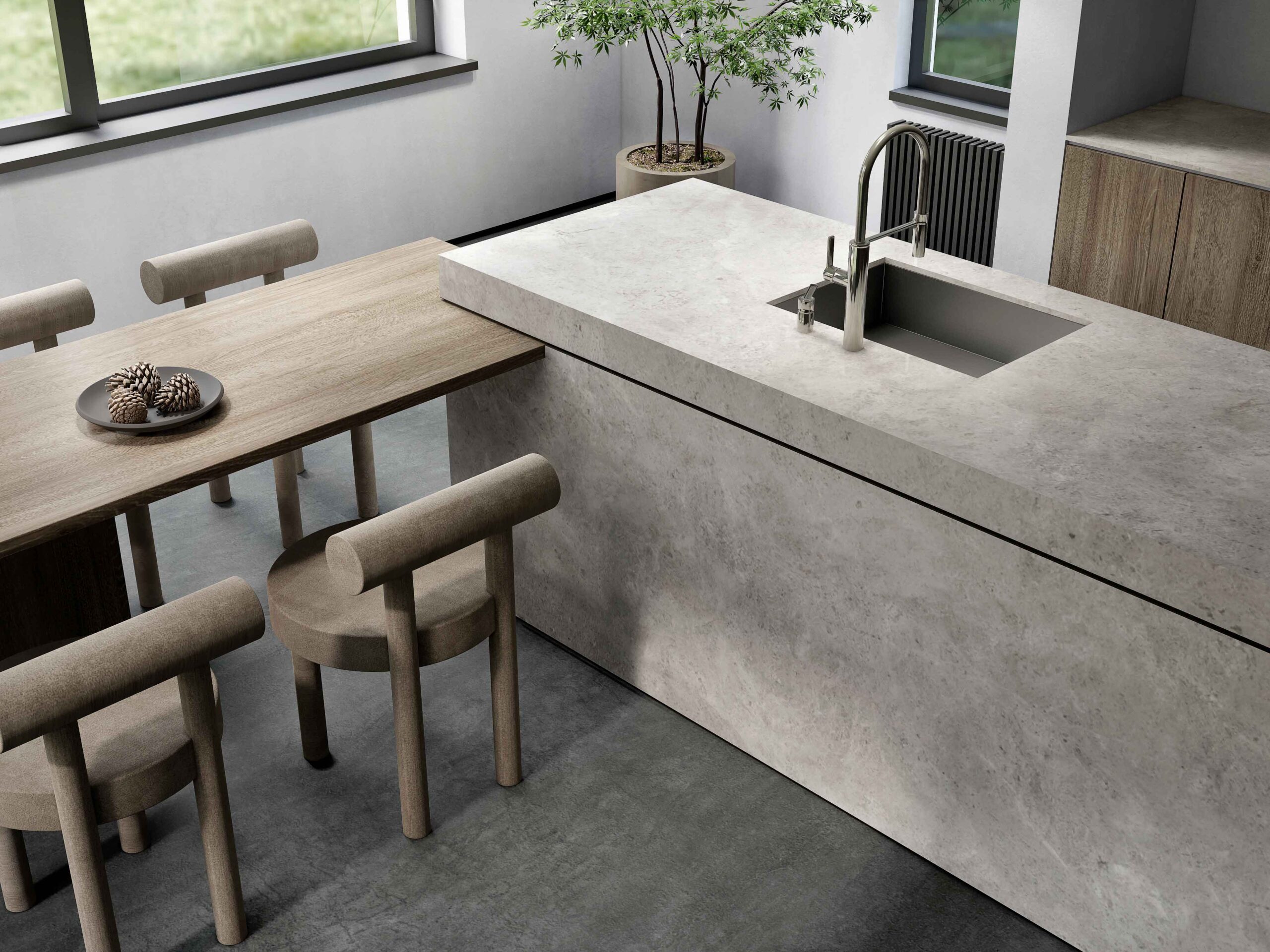 immerse yourself in the idealic mediterrean with this beautiful honed finish sintered stone slab. With a grounding warm glow it will be a perfect centrepiece to a modern organic inspired space.